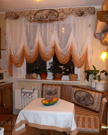 - оформление: чаще всего представленный вид занавесок дополняют рюшами, кистями, тесьмой или бахромой, привносящих в драпировку атмосферу стильности и утонченности, а также позволяющих изделию выглядеть нарядно;