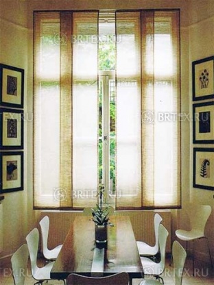 Полотна японских тканевых панелей шириной в 80 – 90 см используют для оформления панорамных окон. Двухрядные композиции из текстиля и нетканого материала сделают оригинальным окно квартиры, салона, кафе.